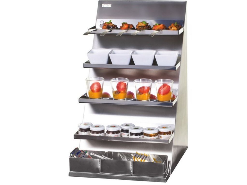 Stojan s 5 nerezovými poličkami a 3 nerezovými miskami do bufetu patří mezi nepostradatelné kousky ve vašem podniku. Svým elegantním designem parádně doplní stoly naplněné lahodnými pokrmy. Skvěle se hodí pro müsli, oříšky, sušené i čerstvé ovoce, medy, marmelády másla a další. Jedná se o vkusné řešení, jak na relativně malém místě umístit více produktů.