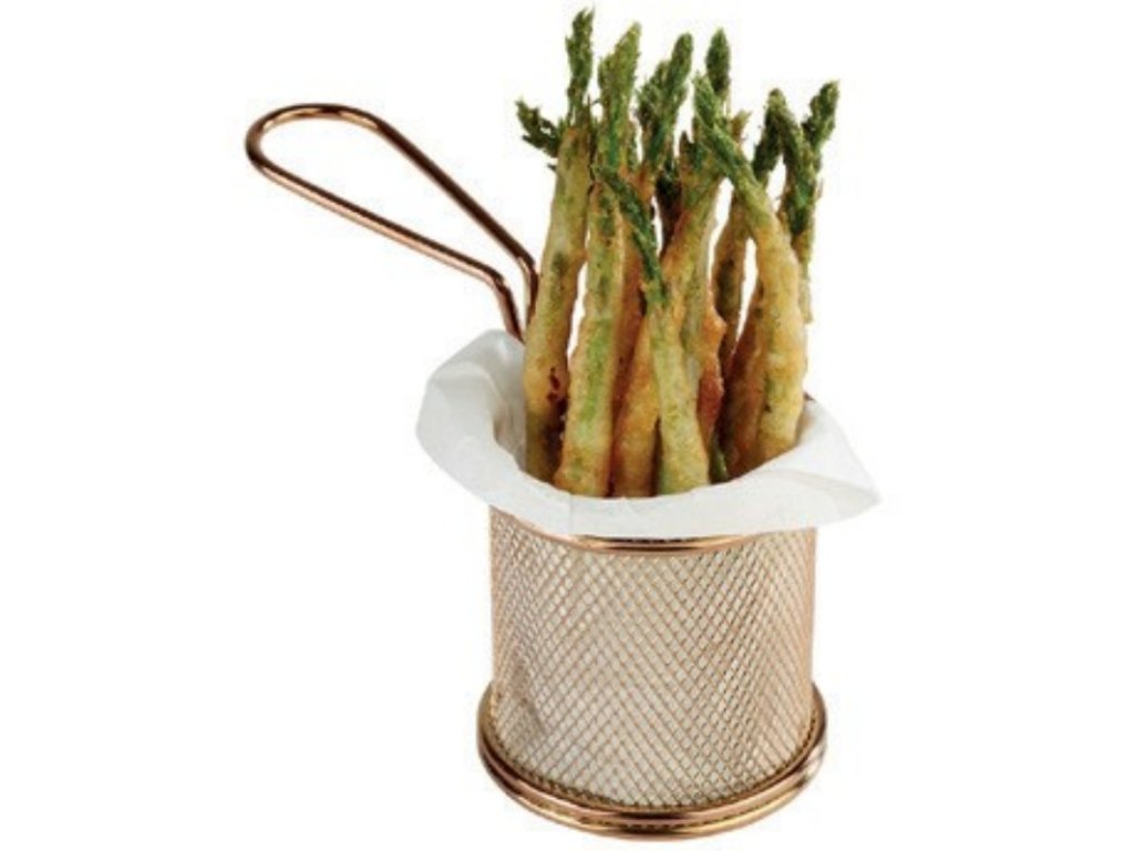 Menší servírovací košík umožňuje smažit malé množství zeleniny, brambor, krevet nebo čehokoliv jiného. Také parádně poslouží k samotné prezentaci pokrmů na jídelním stole. K představování doporučujeme nejprve vložit olejový papír do košíku a až na něj umístit smažené jídlo. Tak dosáhnete jednoduchého a stylového efektu. Košík se vyrábí z kvalitní nerezové oceli a zajišťuje elegantní způsob prezentace vašich pokrmů.