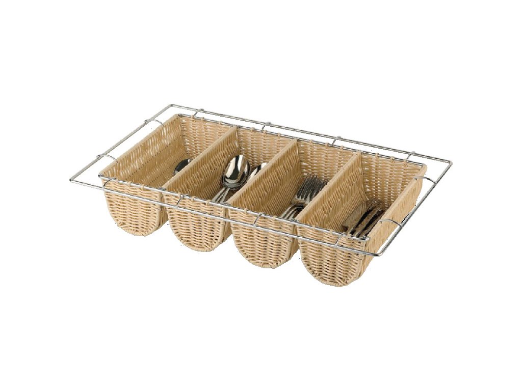 I příbory můžete nabízet elegantním způsobem. Tento omyvatelný příborník z polyratanu v proutěném designu disponuje čtyřmi přihrádkami pro každý druh příboru a svým pěkným vzhledem tak parádně doplní váš bufetový systém. Je vhodný do myčky nádobí. Kovová konstrukce usnadňuje manipulaci.