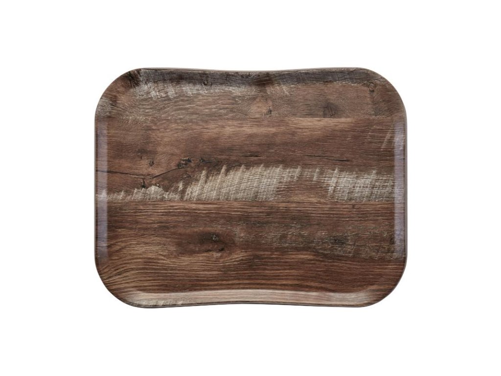 Polyesterový podnos s dřevěnou texturou v provedení tmavého dubu působí vkusně a elegantně. Má protiskluzovou povrchovou úpravu a perfektně se tak hodí do zátěžových provozů, jako jsou kantýny, nemocnice, hotely, fastfoody, školy, školky atd. Lze jej mýt v myčce nádobí bez omezení denních cyklů. Odolá teplotám od –40 °C až do +90 °C.
