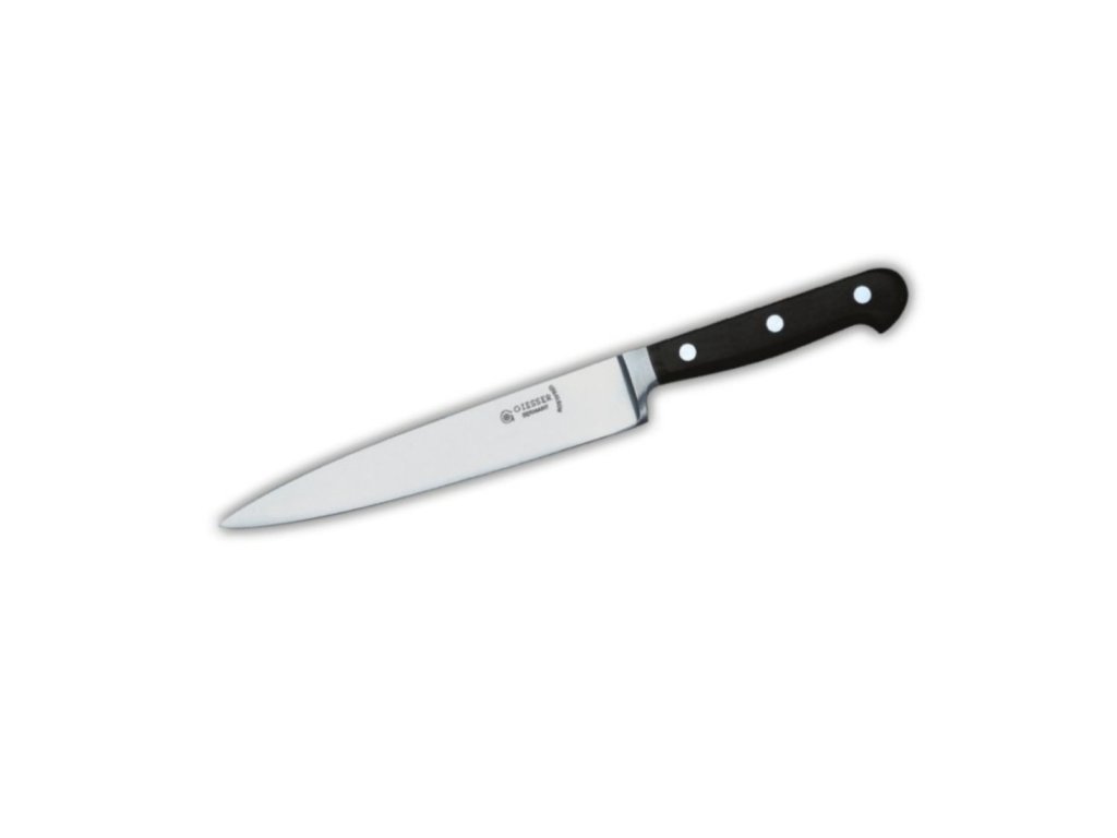 Kovaný nůž od značky Giesser je symbolem dokonalé balance mezi mistrovsky naostřenou čepelí a rukojetí, která se pohodlně drží.