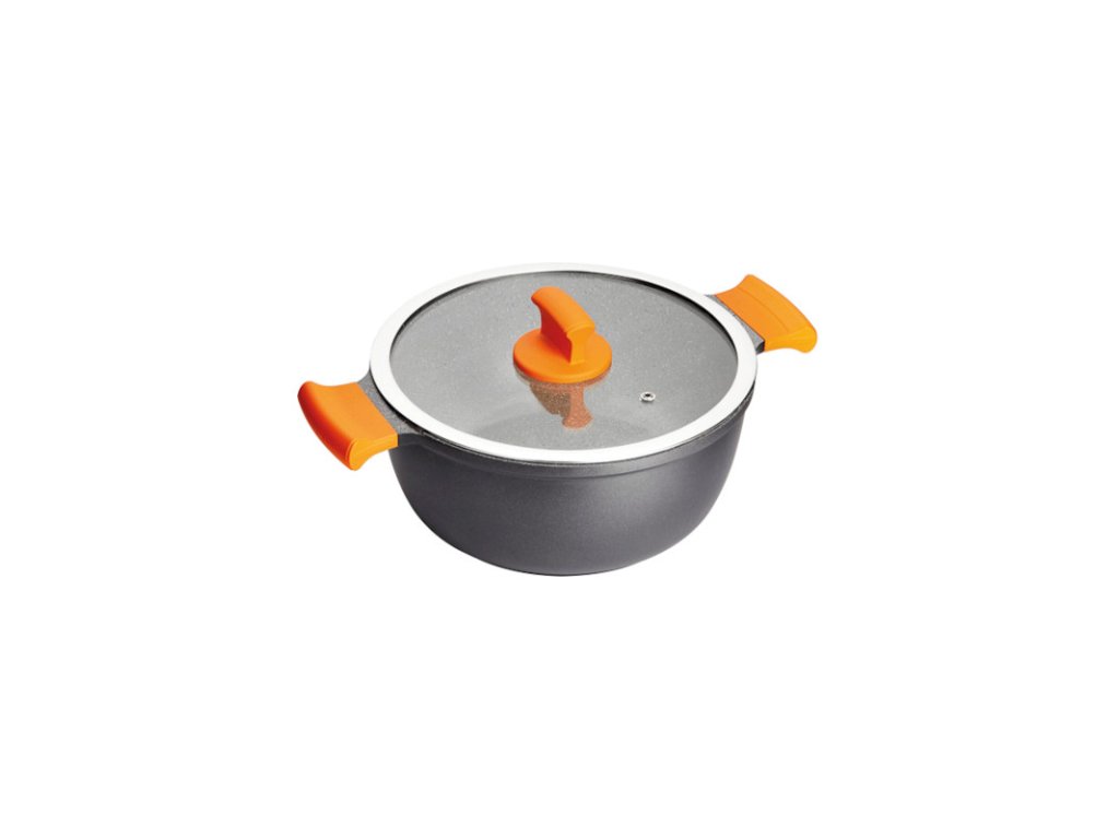 Skleněná poklice umožňuje sledovat jídlo během vaření, aniž by se sundávalo víko, což šetří energii. Parní uzávěr zabraňuje zapařování poklice a vypouští přebytečnou páru, čímž zabraňuje jeho nadzvednutí. Povrchová úprava s kamenným efektem. Tento vkusný design doplňují veselé oranžové měkké rukojeti a úchyt.