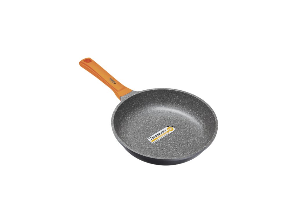 Povrchová úprava s kamenným efektem. Tento vkusný design doplňují veselé oranžové měkké rukojeti.