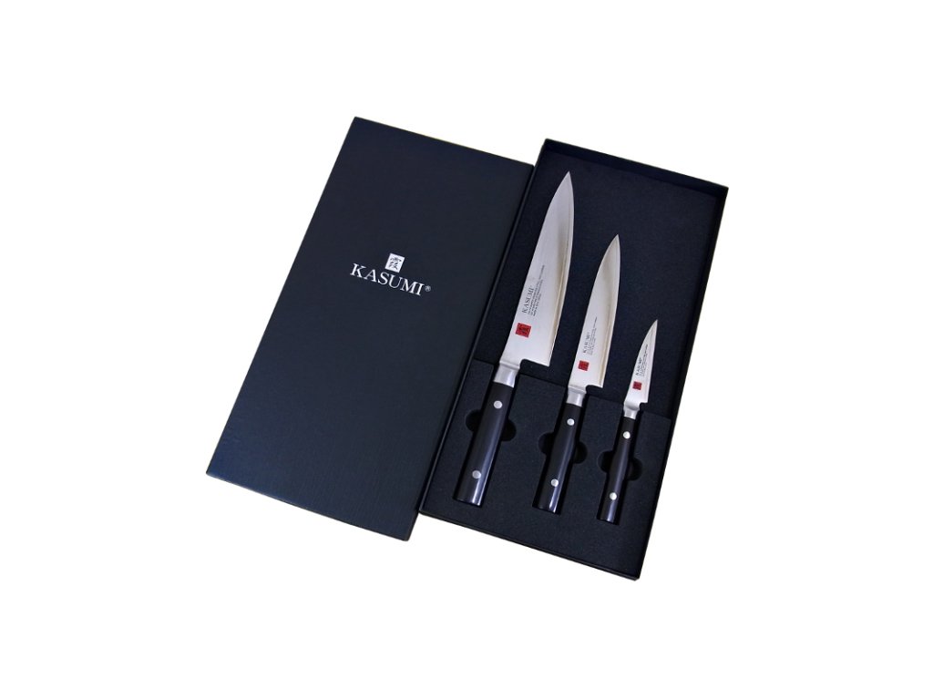 Nože KASUMI. VG-10 je nerezová ocel s velmi dobrou trvanlivostí ostří. Set obsahuje: kuchařský nůž 20 cm, univerzální 15 cm a nůž na zeleninu 8 cm.