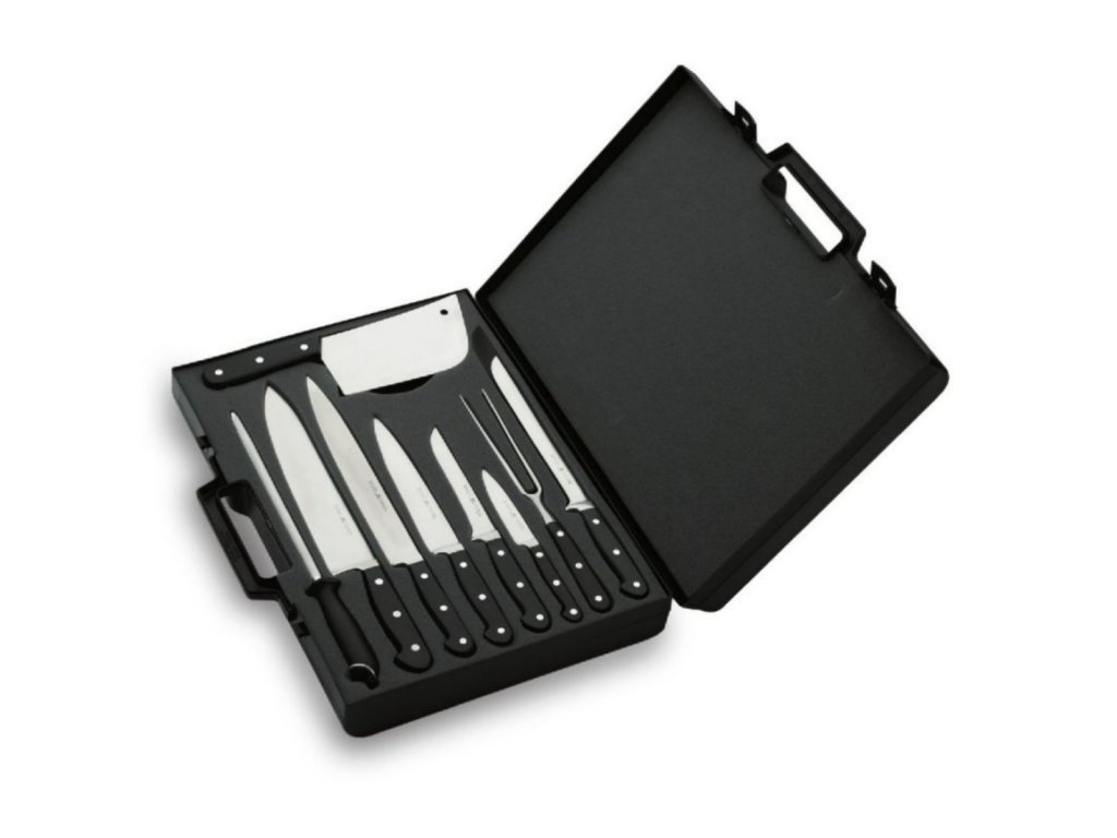 Plastový kufr obsahuje soupravu 9 celokovaných profesionální nožů. Nože se vyrábí z jednoho kusu nerez oceli a špičkové tvrdosti, která na českém trhu nemá konkurenci. Pevně nýtovaná rukojeť s výbornou ergonomií je bezpečná a dobře se drží v ruce.