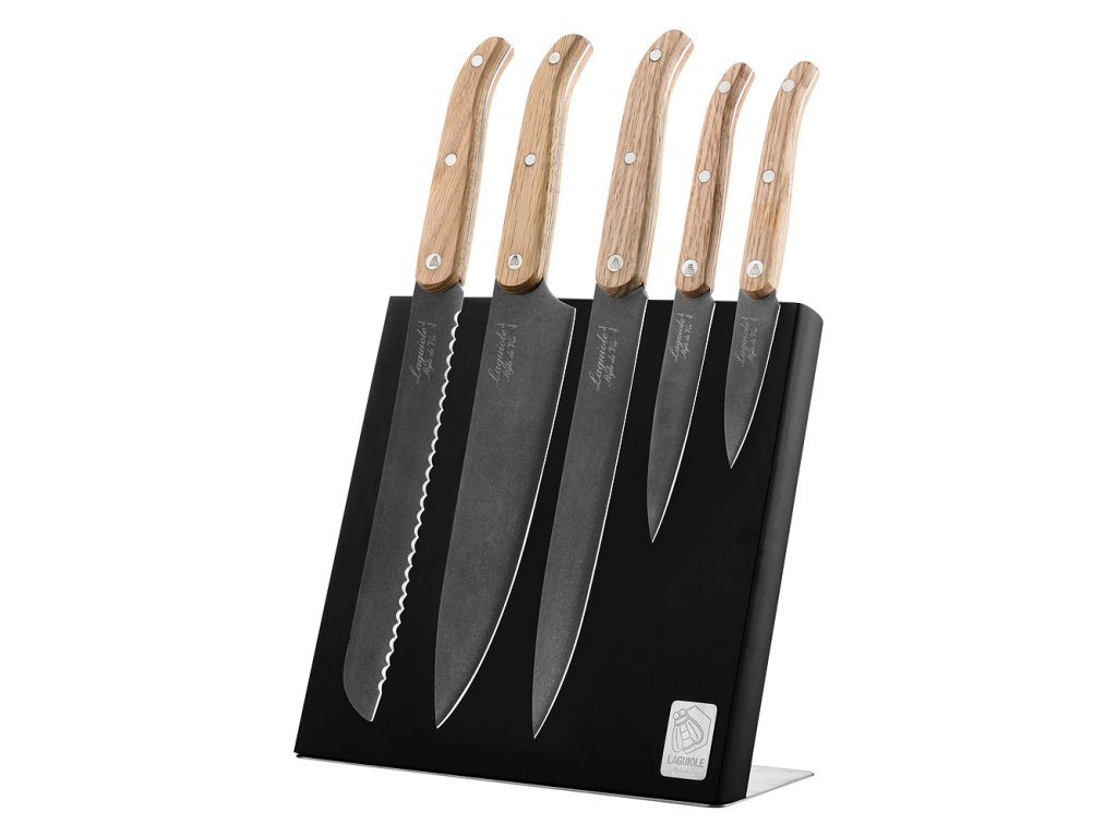 LAGUIOLE Innovation - sada nožů, rukojeť dubová, povrchová úprava čepele stonewash a magnetický stojan na nože