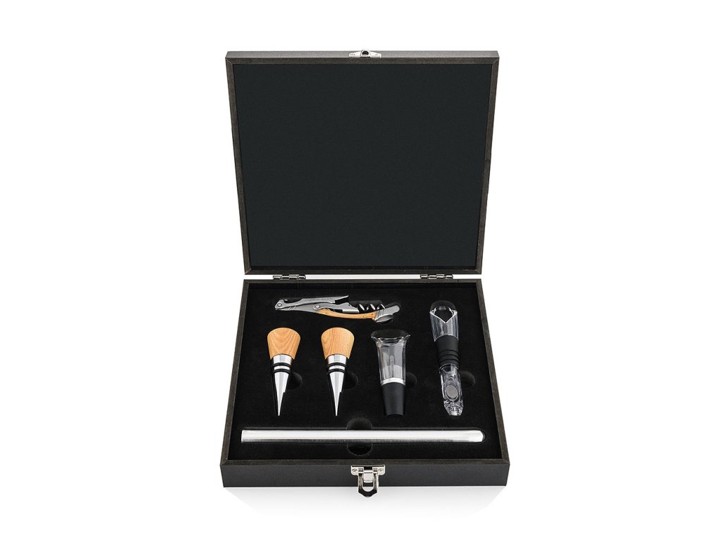 Balení 1 ks vývrtka na víno / 2 ks zátky / vylévací hubice / vylévací hubice s chladící tyčinkou / černá devěná kazeta