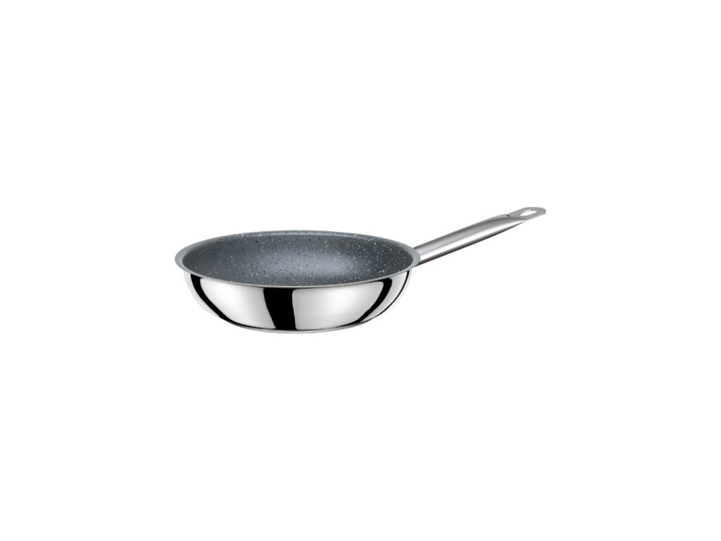 Kvalitní pánev vyrobená z vysoce leštěné nerezové oceli 18/10. Má tlusté, třívrstvé „sendvičové“ dno, zesílený nepřilnavý povlak a uvnitř mramorovou konstrukci. Rukojeť je žáruvzdorná, odvětraná a bez nýtů. Hodí se pro smažení na másle, a to i na indukci. Ovšem už se jí tak moc nelíbí v myčce nádobí.