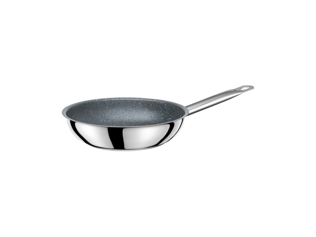 Kvalitní pánev vyrobená z vysoce leštěné nerezové oceli 18/10. Má tlusté, třívrstvé „sendvičové“ dno, zesílený nepřilnavý povlak a uvnitř mramorovou konstrukci. Rukojeť je žáruvzdorná, odvětraná a bez nýtů. Hodí se pro smažení na másle, a to i na indukci. Ovšem už se jí tak moc nelíbí v myčce nádobí.