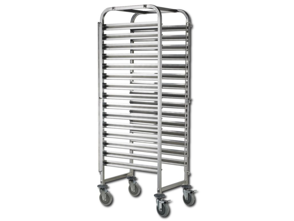 Vozík na 15 táců rozměru 53x325mm. 2 kolečka s brzdou. Dodáván demontovaný.